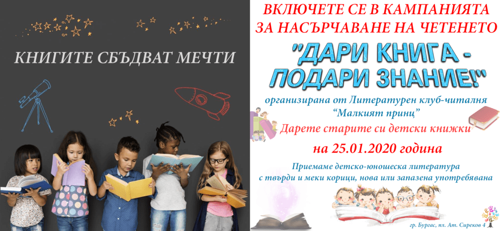 Читалня „Малкият принц“ стартира кампания за насърчаване на четенето в Бургас. Тя е под надслов „Дари книга – подари знание“ и ще започне на 25 януари в 16:30 часа. От читалнята призоваха всички, които желаят да се включат, да дарят нови или употребявани, но запазени детски книжки. Ще се приема всякаква детско-юношеска литература с твърди или меки корици.