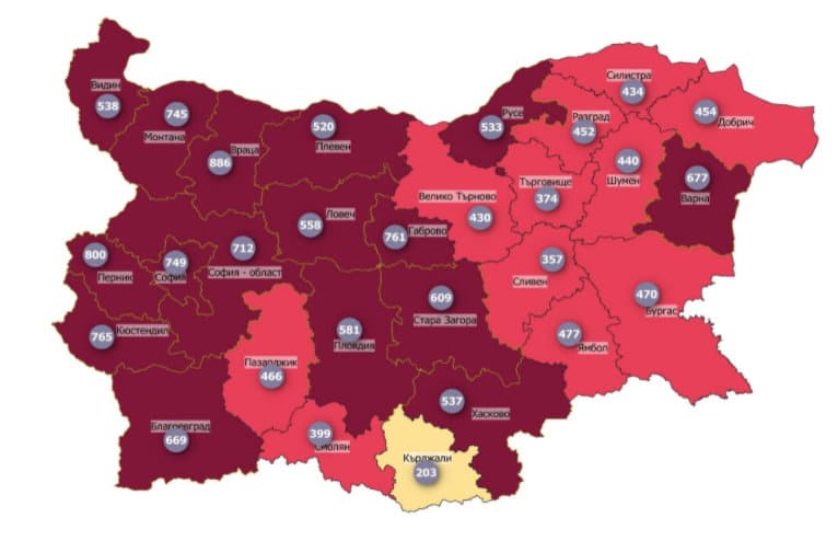 12 области в България вече не са в тъмночервената зона. Това показва справка на сайта на Националния център по заразни и паразитни болести. Заболеваемостта спада и вече е 559.56 на 100 000 души.