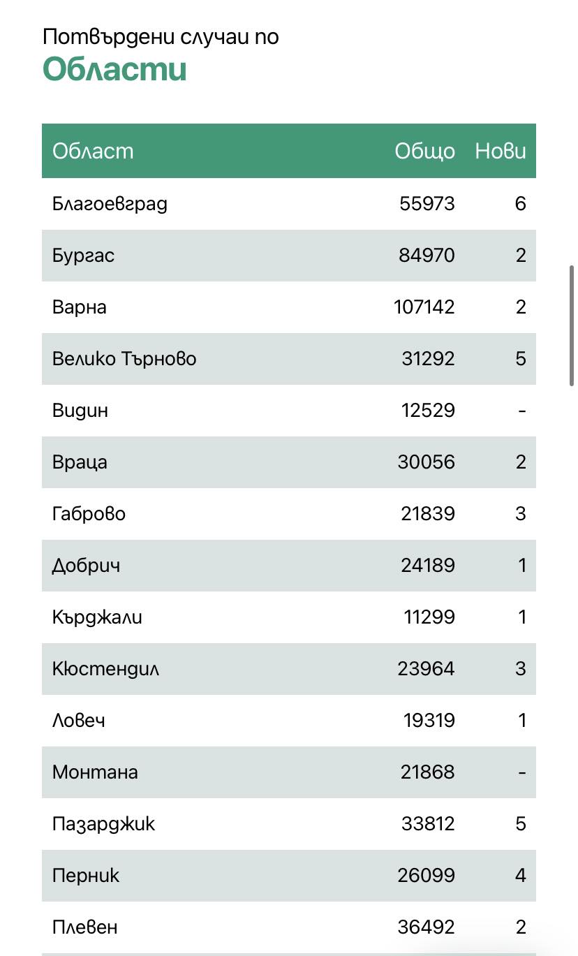 Петима души са починали през последните 24 часа. 20% от тях не са били ваксинирани. Общият брой на изгубилите битката за живота си е 38 397.