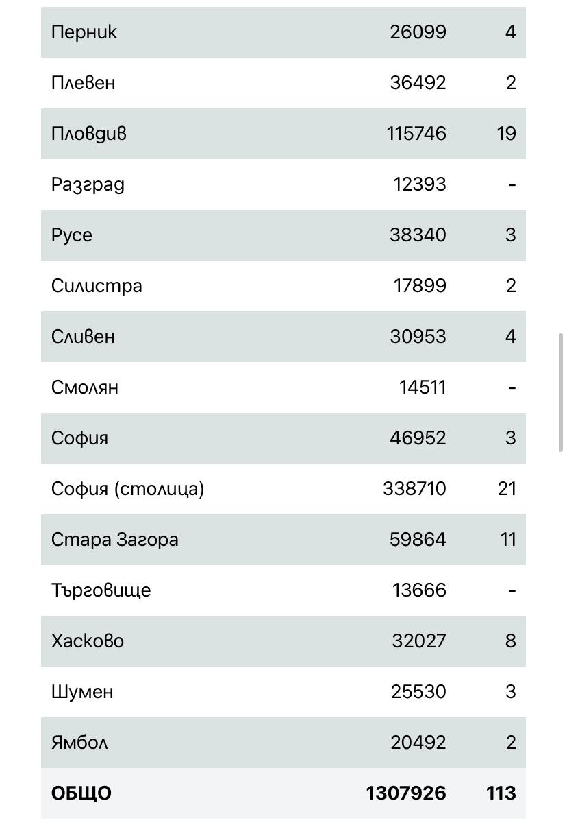 113 нови случая на COVID-19 са били установени у нас през изминалото денонощие от направени 2690 теста, показват данните в Единната информационна система. 71,68% от новозаразените не са ваксинирани. Общо потвърдените случаи от началото на пандемията са 1 307 926 като активните са 1925.