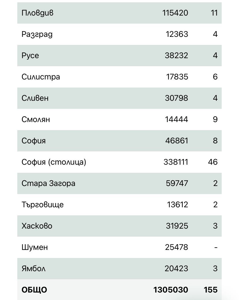 155 нови случая на COVID-19 са били установени у нас през изминалото денонощие от направени 2243 теста, показват данните в Единната информационна система. 61.29% от новозаразените не са ваксинирани. Общо потвърдените случаи от началото на пандемията са 1 305 030 като активните са 2624.