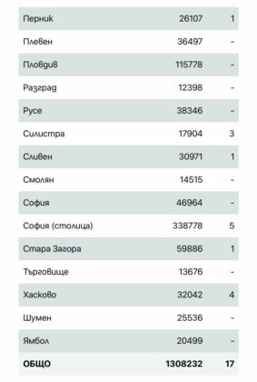 17 нови случая на COVID-19 са били установени у нас през изминалото денонощие от направени 275 теста, показват данните в Единната информационна система. 58,82% от новозаразените не са ваксинирани. Общо потвърдените случаи от началото на пандемията са 1 308 232 като активните са 1874.