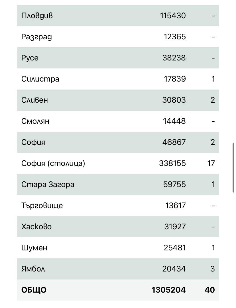 40 нови случая на COVID-19 са били установени у нас през изминалото денонощие от направени 534 теста, показват данните в Единната информационна система. 65.00% от новозаразените не са ваксинирани. Общо потвърдените случаи от началото на пандемията са 1 305 204 като активните са 2699.