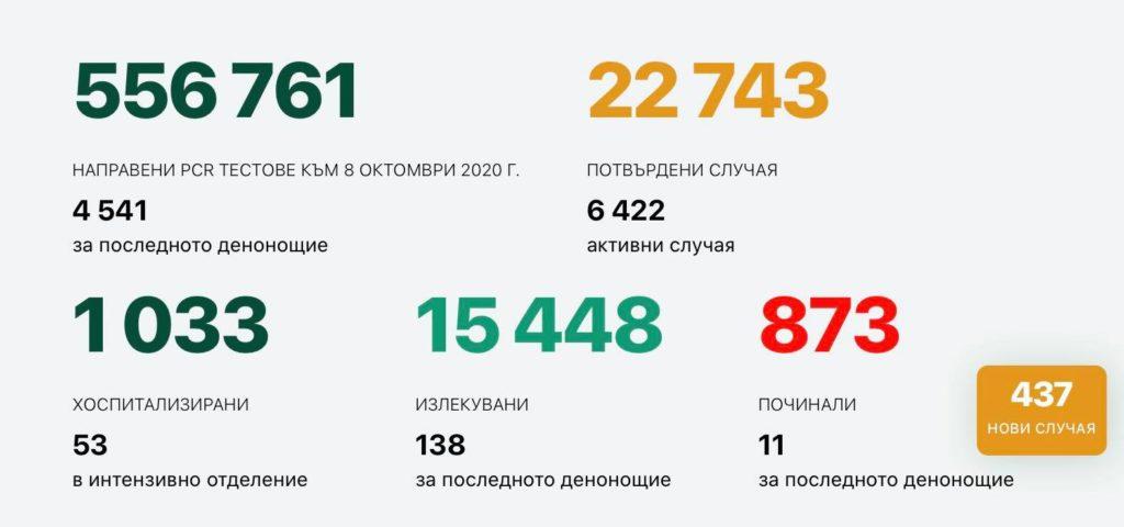 437 нови случая на COVID-19 са били установени у нас през изминалото денонощие от направени 4541 PCR теста, показват данните в Единната информационна система. Общо потвърдените случаи от началото на пандемията са 22 743, като активните са 6422.