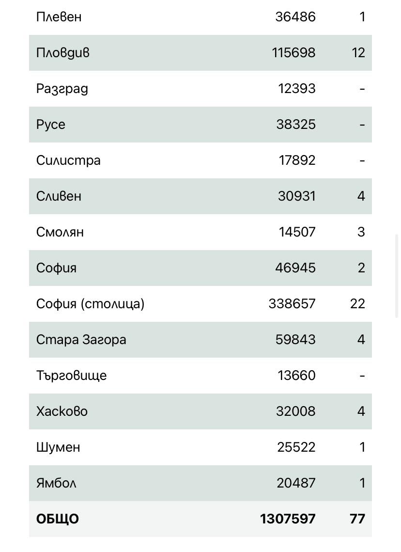 77 нови случая на COVID-19 са били установени у нас през изминалото денонощие от направени 1875 теста, показват данните в Единната информационна система. 67,53% от новозаразените не са ваксинирани. Общо потвърдените случаи от началото на пандемията са 1 307 597 като активните са 1925.