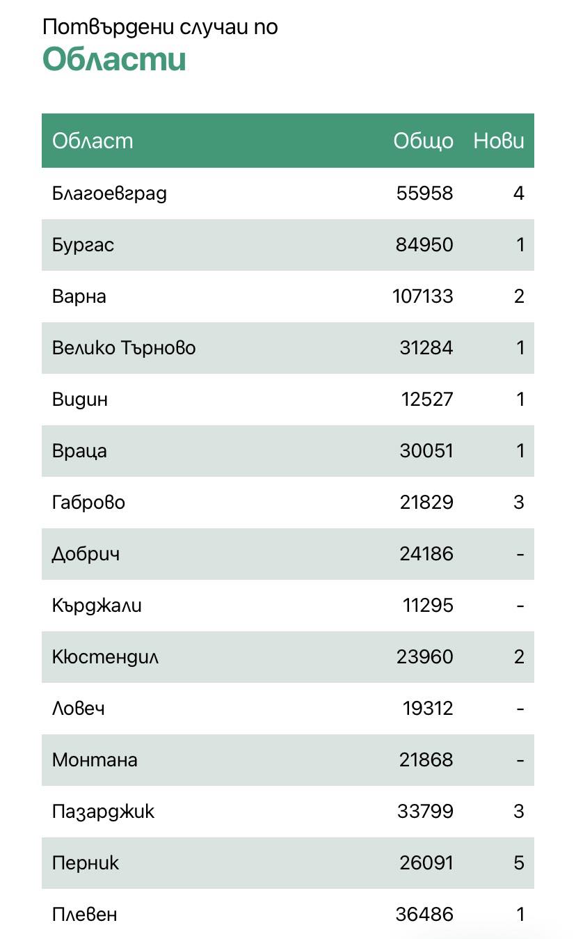 Двама души са починали през последните 24 часа. 100% от тях не са били ваксинирани. Общият брой на изгубилите битката за живота си е 38 385.