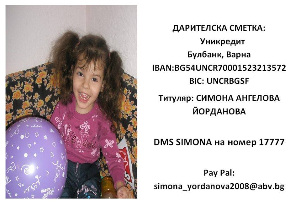 През март 2018 г. на Симона е направена активна страница във Facebook. Има и в HelpKarma, а от септември 2018 г. е започнала ДМС кампания. До 17 юни събраната сума по дарителската й сметка е 27 025 лева. Необходими са още 75 000 лв., пише „Дарик“.