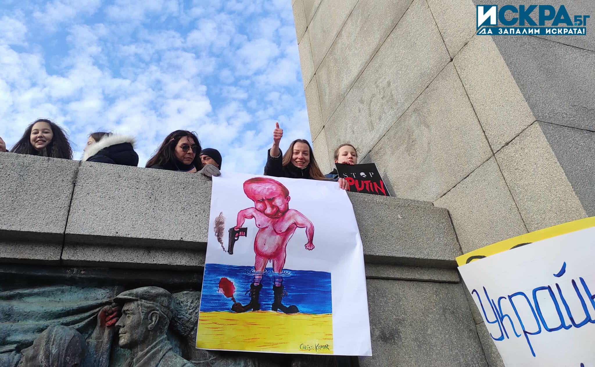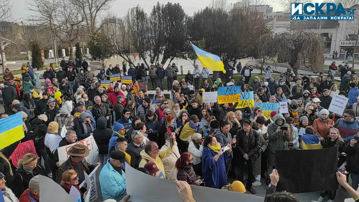 С плакати „Путин е лъжец и военнопрестъпник!“, „Спрете войната!“ и „Долу ръцете от Украйна!“ стотици демонстранти се събраха в центъра на Бургас с настояване за мирно разрешаване на конфликта, предаде репортер на Искра.бг.