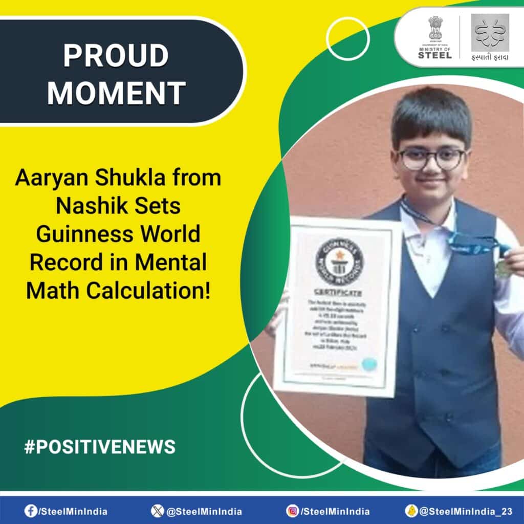 13-годишното чудо Аарян Шукла от индийския щат Махаращра остави безмълвна голяма публика, когато извоюва титла от Световните рекорди на Гинес с невероятните си математически умения. Това съобщиха от пресцентъра на организацията.