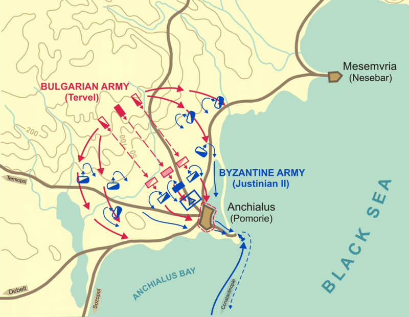 През 705 г. детронираният Юстиниан II Ринотмет-Носоотрязания, успява да избяга след 10-годишно заточение в Херсонес Таврически (дн. Херсон), намираща се на Кримския полуостров и след много премеждия се озовава за помощ при Тервел. Двамата сключват сделка – Юстиниан с помощта на 15 000 българи стига до Константинопол и след преврат си връща престола.
