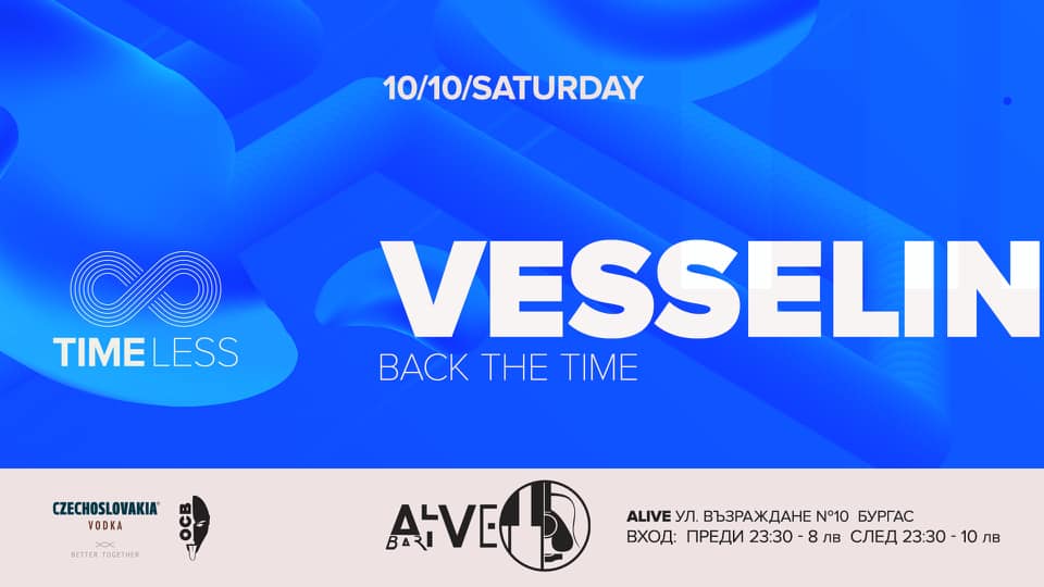 На 10 октомври от 23:00 часа в бургаския клуб “Alive Bar” ще бъде представена втора част на “Timeless” – събитие, на което ще имате възможност да чуете отново някои от най-известните ъндърграунд хаус парчета от близкото минало. Феновете ще могат да се насладят на част от най-големите хитове от електронната сцена, благодарение на уникалните сетове на един от най-добрите клубни DJ – DJ Vesselin. Специално за Искра.бг организаторите коментираха: