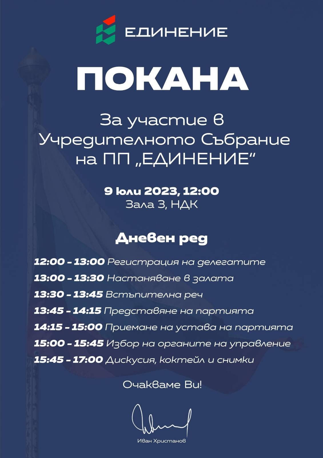 Учредително събрание на партия „ЕДИНЕНИЕ“ ще започне в 12:00 часа в Зала 3 на НДК в столицата и ще продължи до 17:00 часа. По време на него ще бъде приет устав и избор на органите на управление.