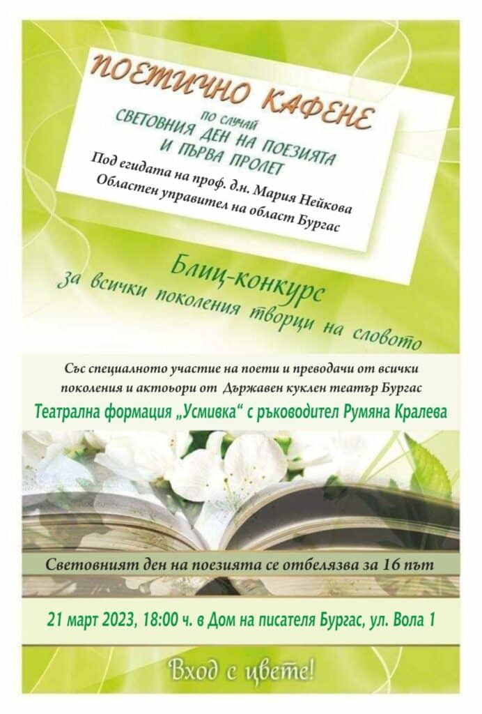 Днес в Бургас ще се проведе 16-ото издание на Световния ден на поезията, съобщиха от Областната управа.