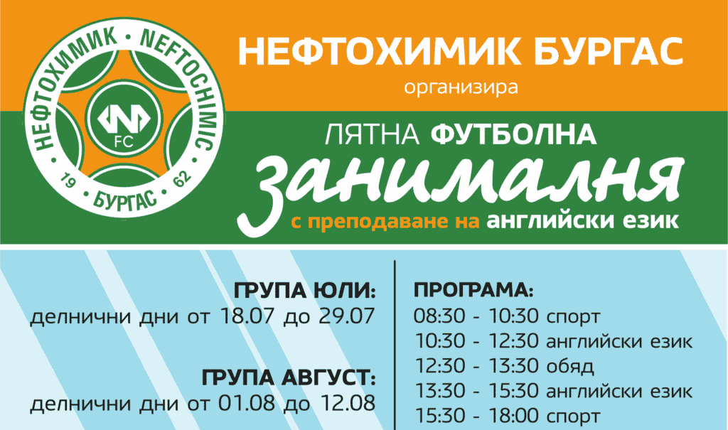 Днес започва записването на лятната футболна занималня с преподаване на английски език, организирана от футболен клуб „Нефтохимик Бургас“. Обучението ще се проведе изцяло на територията на спортен център „Изгрев“ на две групи и ще обхване периодите 18-29 юли, както и 1-12 август.