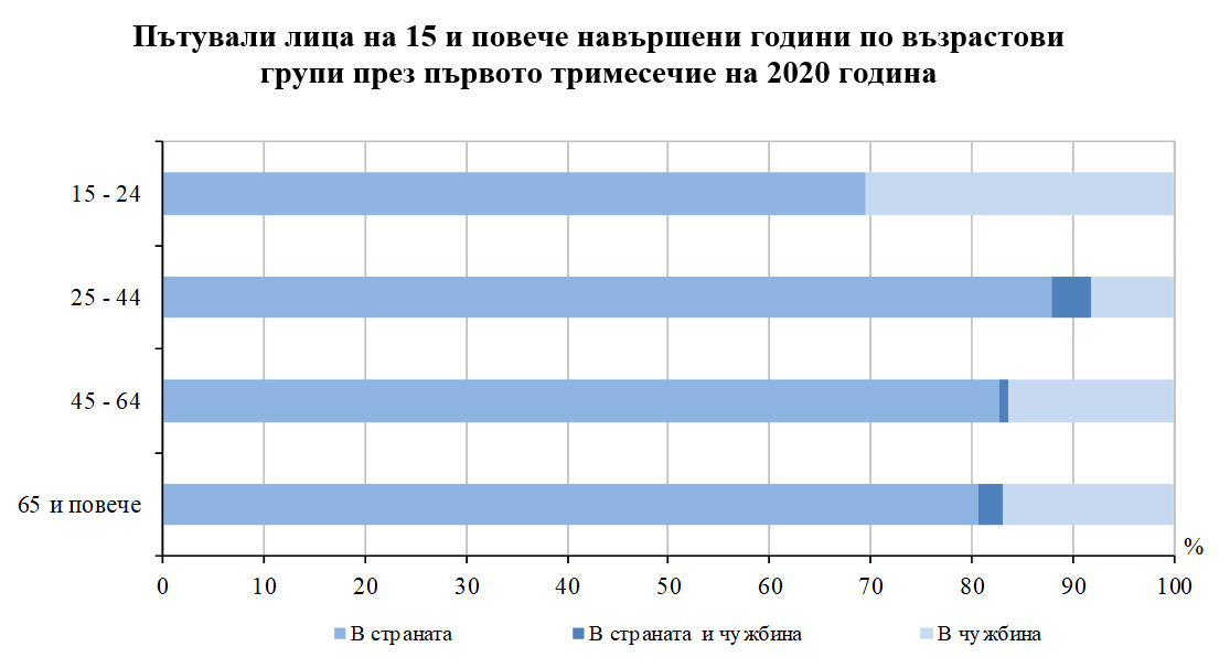 През сегашния период най-много са пътувалите на възраст 25 – 44 години – 242,8 хил., или 49,5% от всички пътували лица. Във всички възрастови групи преобладава относителният дял на пътуванията в страната, като най-висок е при лицата на възраст 25 – 44 години – 87,8% от пътувалите в тази възрастова група.
