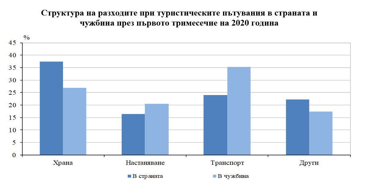 В структурата на разходите по видове с най-голям относителен дял в страната са тези за храна – 37,4%, докато в чужбина са разходите за транспорт – 35,2%. Средният разход при пътуване с лична цел на едно лице на възраст 15 и повече навършени години е 151,75 лв. в страната и 674,37 лв. в чужбина. Същевременно разходите на едно лице за професионално пътуване са средно 155.45 лв. в страната и 1 237.85 лв. в чужбина.