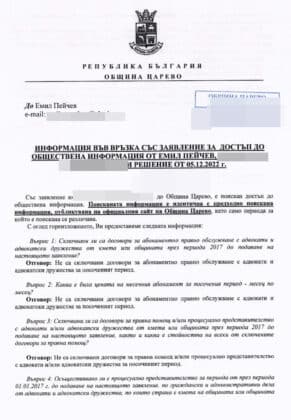 „Не са сключвани договори за абонаментно правно обслужване с адвокати и адвокатски дружества от кмета или общината през периода 2017 до подаване на настоящото заявление.“