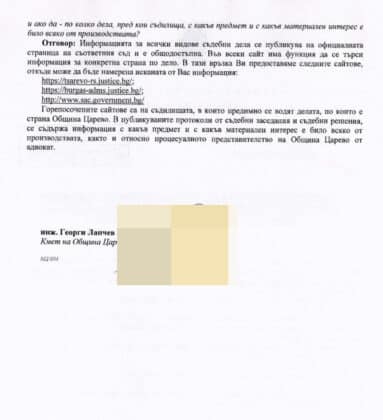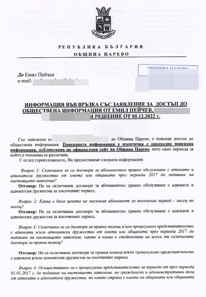 Емил Пейчев е отправил няколко въпроса до кмета Лапчев по Закона за достъп до обществена информация /ЗДОИ/. Общественикът е искал да разбере дали общината е имала сключени договори с адвокати или правни кантори за предоставяне на правна помощ. Искра.бг разполага с официалния отговор до Пейчев от местната управа, в който на всеки от поставените въпроси той е един и същ, а именно: