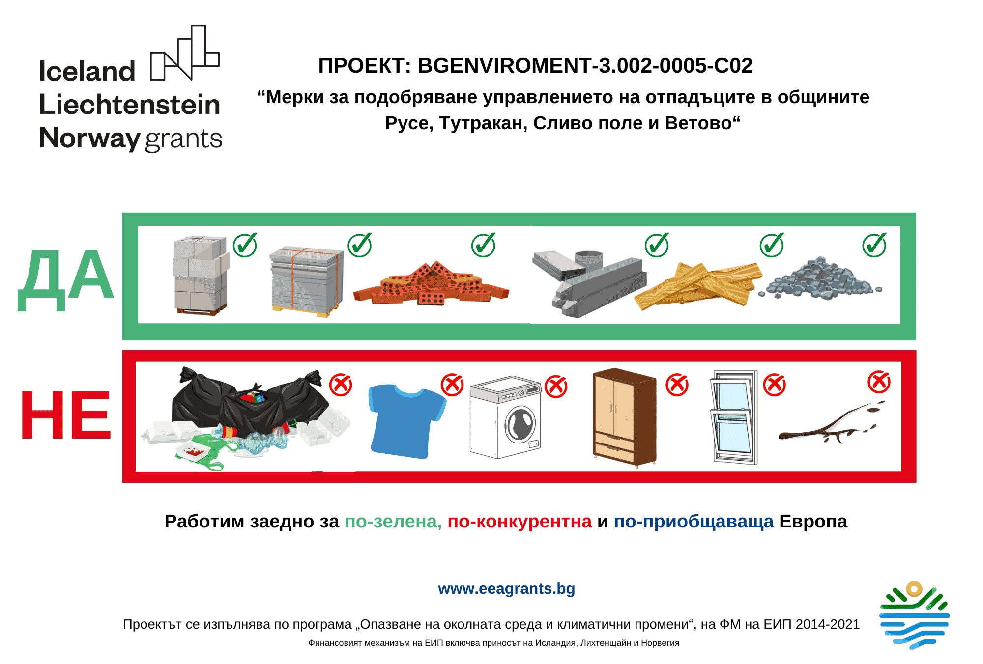 Кампанията за безплатно извозване на строителни отпадъци от домакинствата е част от изпълнението на проект „Мерки за подобряване управлението на отпадъците в общините Русе, Тутракан, Сливо поле и Ветово“ по Програма „Опазване на околната среда и климатичните промени, финансов механизъм на Европейското икономическо пространство 2014-2021 г.“, с програмен оператор Министерството на околната среда и водите.