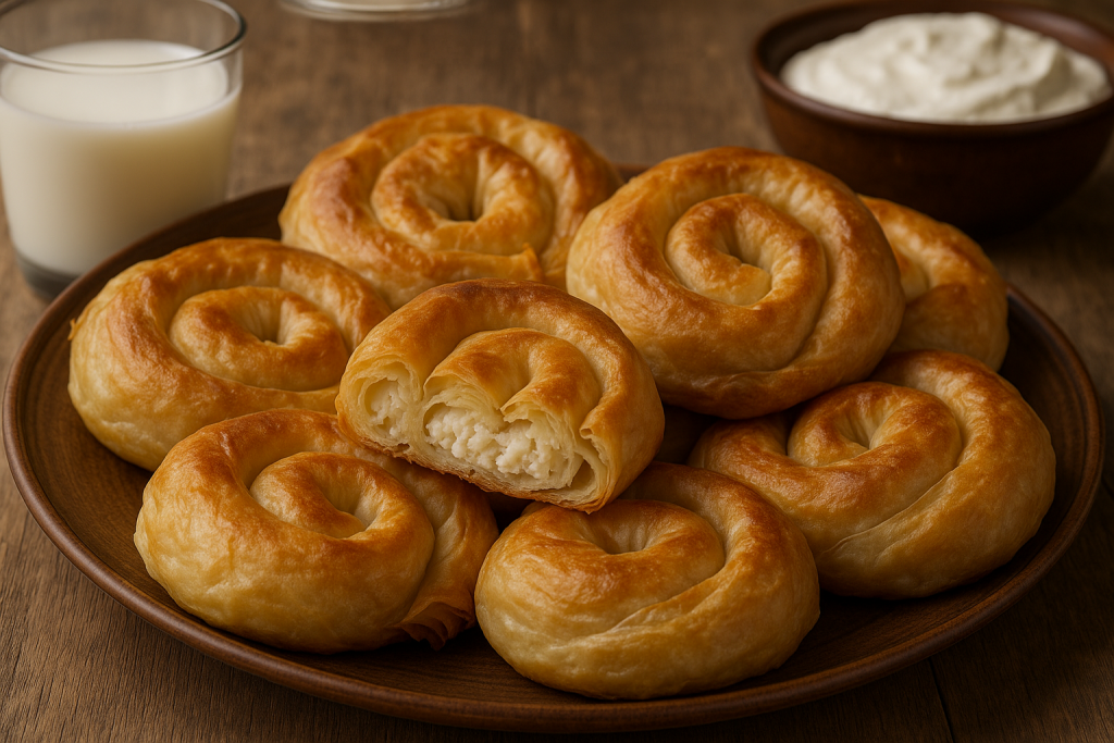 Оставете баничките да отпочинат 5–10 минути. Поднасят се топли, класически – с айрян или чаша кисело мляко.