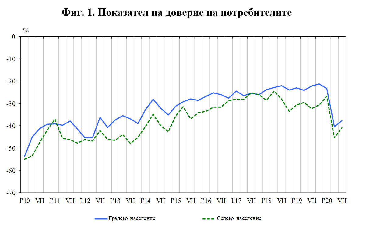 През юли 2020 г. общият показател на доверие на потребителите се покачва с 3.3 пункта в сравнение с април, като при населението в градовете увеличението е 2.7 пункта, а при населението в селата – 4.5 пункта, съобщиха от НСИ.