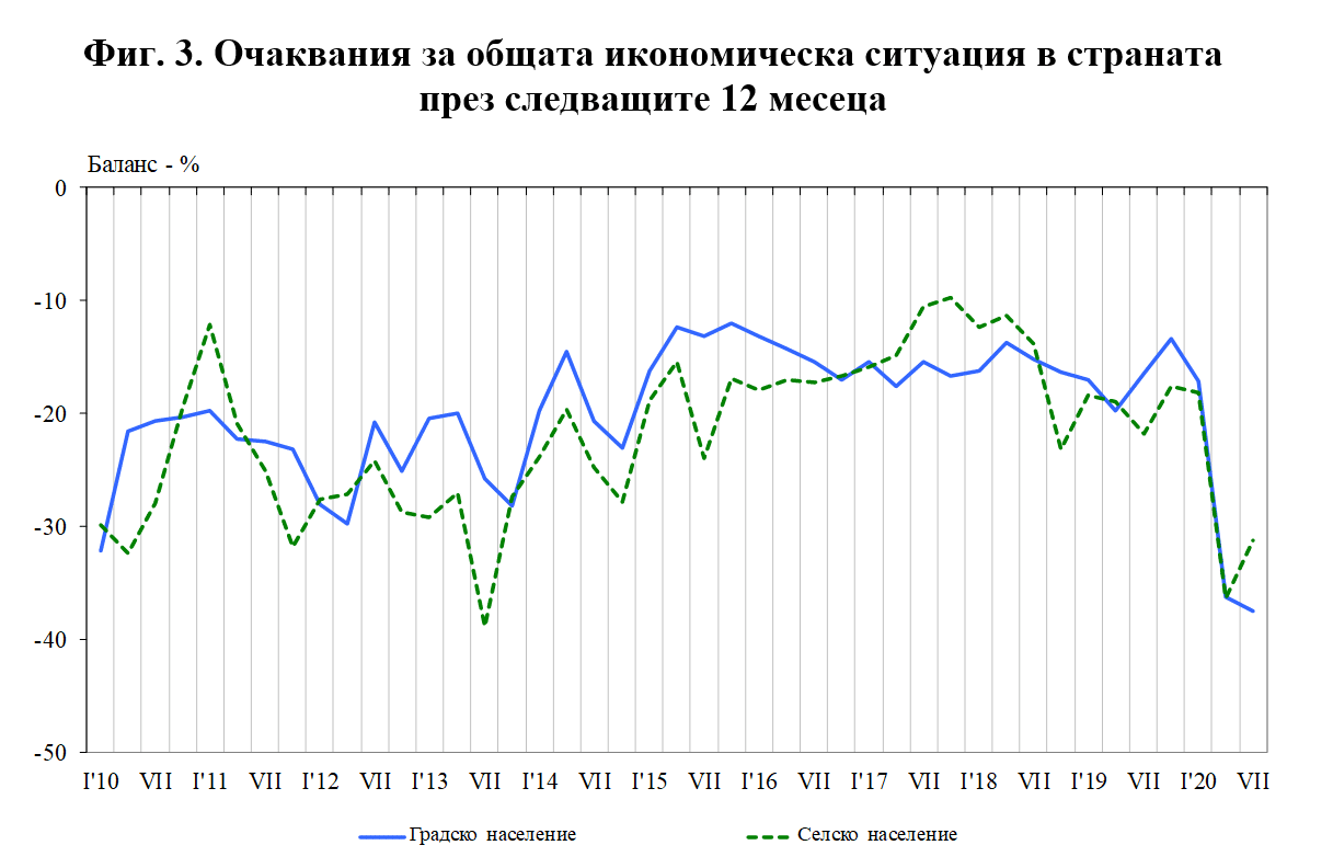 Очакванията на живеещите в селата са тя да продължи и през следващите дванадесет месеца за разлика от населението в градовете, което е малко по-песимистично настроено в сравнение с три месеца по-рано.