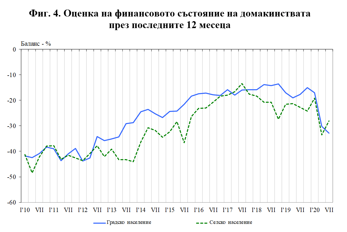 По отношение на финансовото състояние на домакинствата оценките на населението в селата леко се подобряват, докато мненията на живеещите в градовете са по-резервирани.