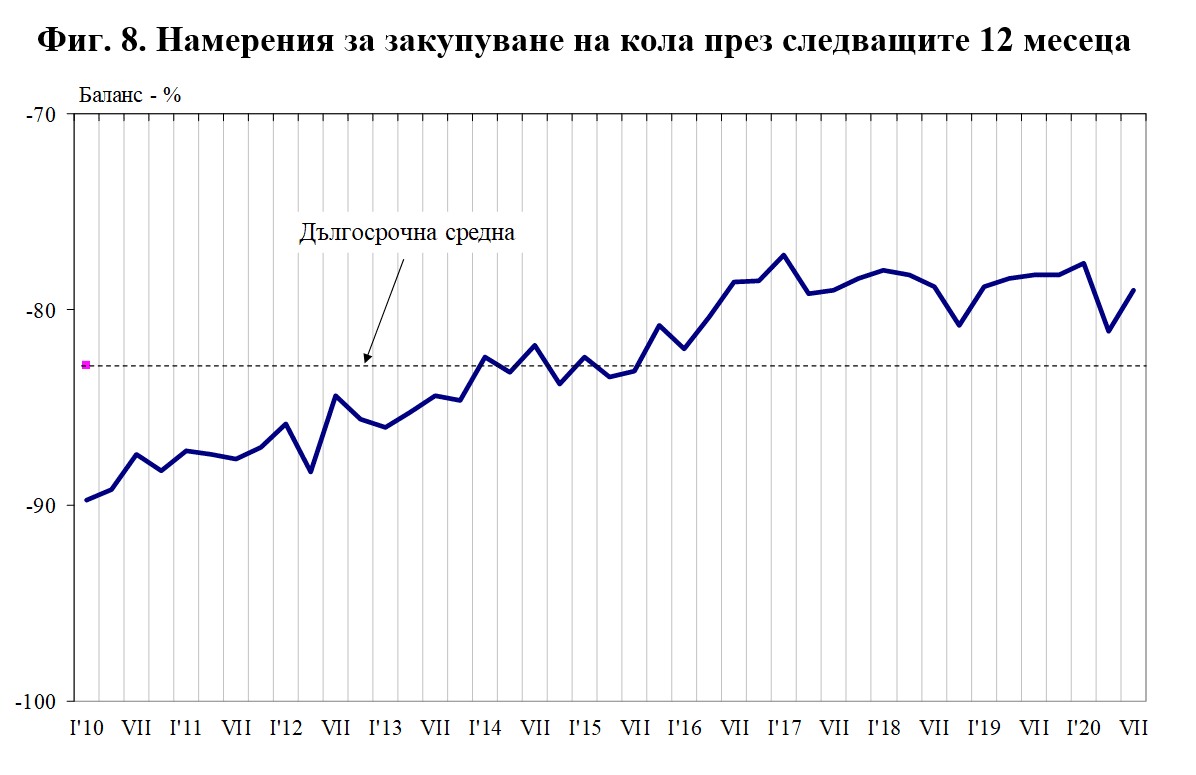 Последната анкета регистрира малко по-позитивна нагласа в намеренията на потребителите да извършват разходи за „покупка на кола“ през следващите дванадесет месеца.