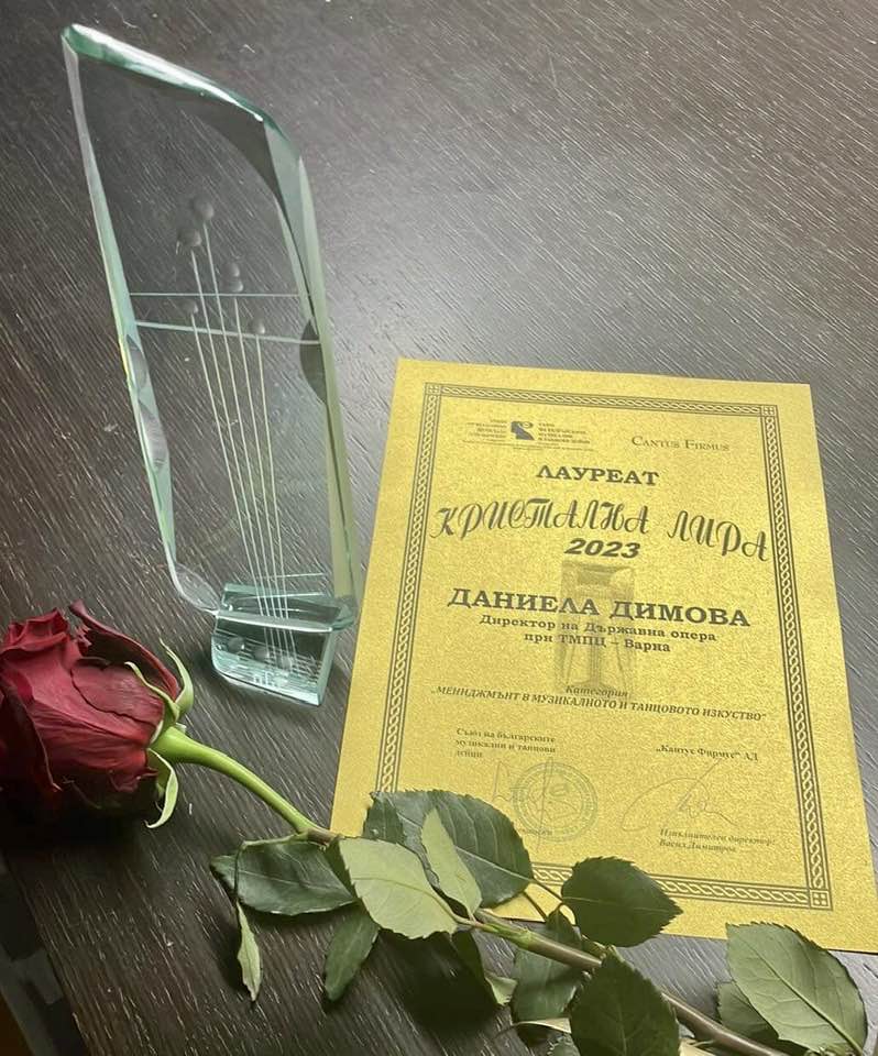Пред многобройната публика в зала 1 на НДК на директора на Театрално-музикален продуцентски център – Държавна опера Варна Даниела Димова бе връчена наградата „Кристална лира“ в категория „Мениджмънт на музикалното и танцовото изкуство“ за 2023 г., която поднесе Станислав Почекански, председател на Съюза на българските музикални и танцови дейци.
