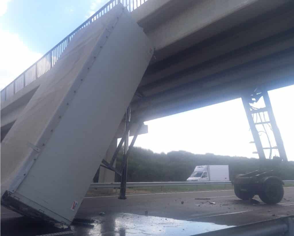 Сигнал е получен в 16:20 часа. Според първоначалната информация товарен автомобил с несвалено ремарке, при преминаване под надлез и несъобразяване на височината, е заклещил ремаркето между пътното платно и надлеза, като същото се е откъснало и запушило дясната пътна лента.