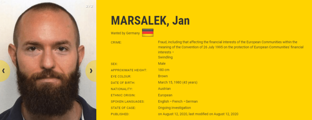 43-годишният Марсалек е издирван от „Европол“ за измама, включително засягаща финансовите интереси на Европейските общности по смисъла на Конвенцията от 26 юли 1995 година за защита на финансовите интереси на Европейските общности. Той е обявен за издирване през август 2020 година.