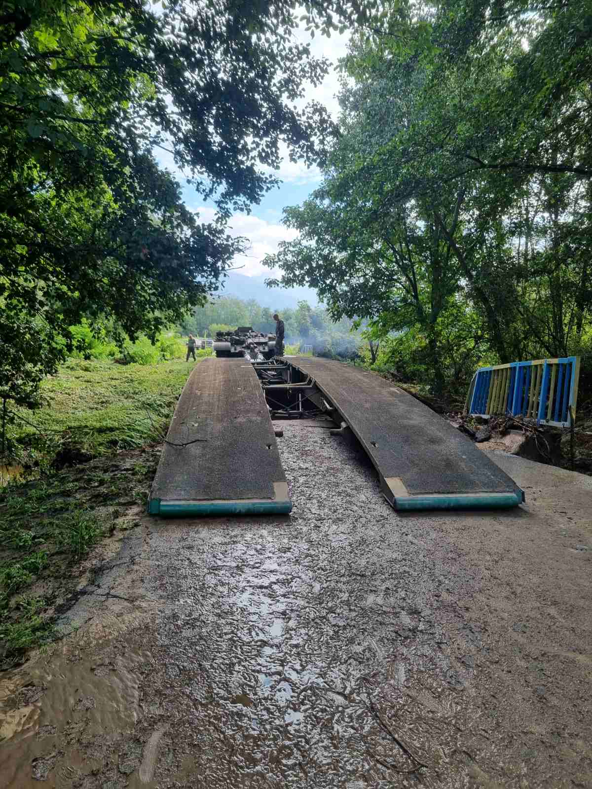 Военнослужещи от 91-и инженерен батальон за обща поддръжка от състава на 55-и инженерен полк – Белене инспектират участък в района на село Слатина, за да установят възможността и необходимостта от поставяне на временен мост.