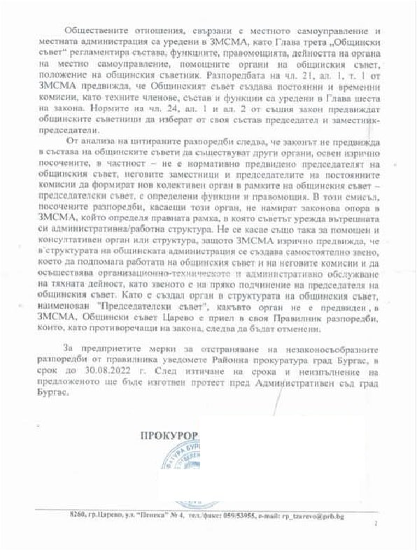 „На мен обаче буквално ми писна от тази арогантност на управляващите в Царево, затова подадох сигнал до прокуратурата, за да сезирам компетентните органи за въведената порочна практика. Само ако знаете, колко хора ми казваха, че няма смисъл, че нищо няма да стане. От Прокуратурата обаче реагираха. От тази институция известяват председателя на Общинския съвет, че решенията на председателския съвет не намират никаква опора в Закона за местното самоуправление. Иначе казано няма как председатели на групи в Общинския съвет да поставят себе си над самия Общински съвет“, подчерта общественикът.