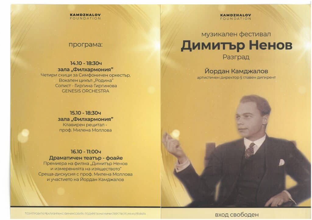 В три поредни дни разградчани ще могат да чуят маестро Камджалов с Genesis orchestra, Гиргина Гиргинова и проф. Милена Моллова. Отделно ще имат възможността да видят филма „Димитър Ненов и измеренията на изяществото“, съобщиха от Община Разград.