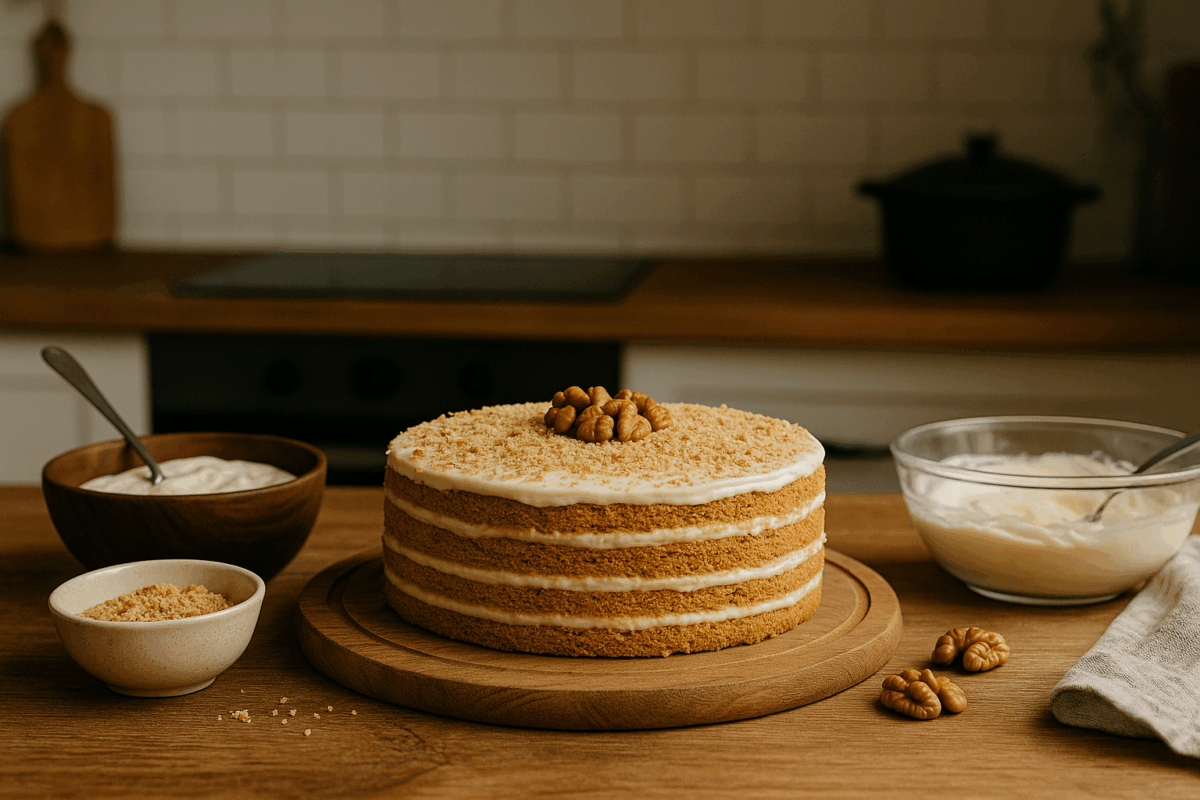 Френската селска торта (известна още като gâteau rustique français) не блести със сложност, но точно в това се крие нейното очарование – мек блат с наситен вкус на мед и орехи, редуващ се с лек крем, който се топи в устата. Това е тортата, която не се стреми към съвършенство във визията, а завладява с домашен вкус и аромат на спомени. Ето как да си я приготвите сами у дома: