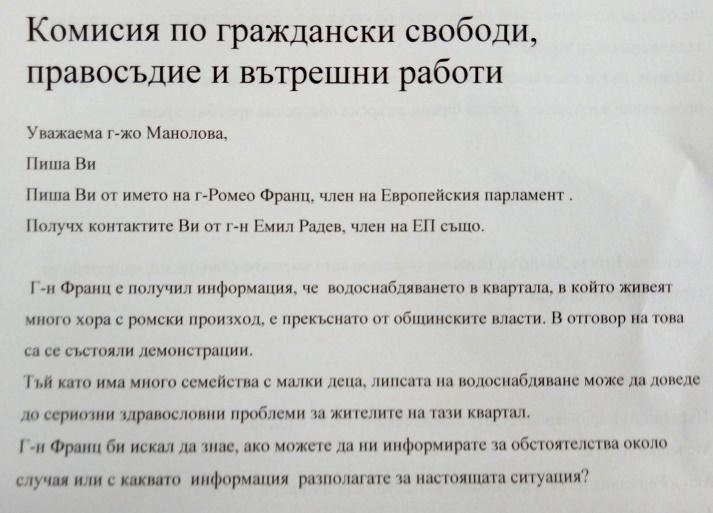 Евродепутатът от германската Зелена партия Ромео Франц попита с официално писмо Община Бургас защо е спряла водоподаването на няколко къщи в квартал „Победа“, населен предимно с цигани.