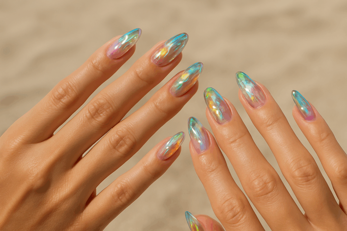 Глазирани нокти: Използване на хром пудра върху цветен гел лак за постигане на перлен и отразяващ ефект.