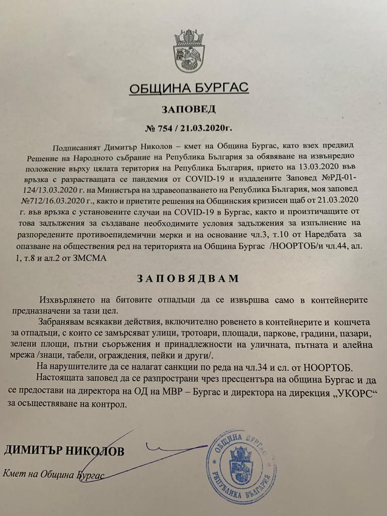 Ще бъде наложена глоба до 5000 лева на всеки, който изхвърля отпадъци извън определените за това места. Естеството и обемът на боклука не са от значение, гласи заповед на кмета Димитър Николов от днес. Тя е издадена след заседание на Общинския кризисен щаб и във връзка с констатираните случаи на COVID-19, както и произтичащите от това задължения за създаване на условия за изпълнение на разпоредените противоепидемични мерки на основание чл.3 , т.10 от Наредбата за опазване на обществения ред на територията на Община Бургас.