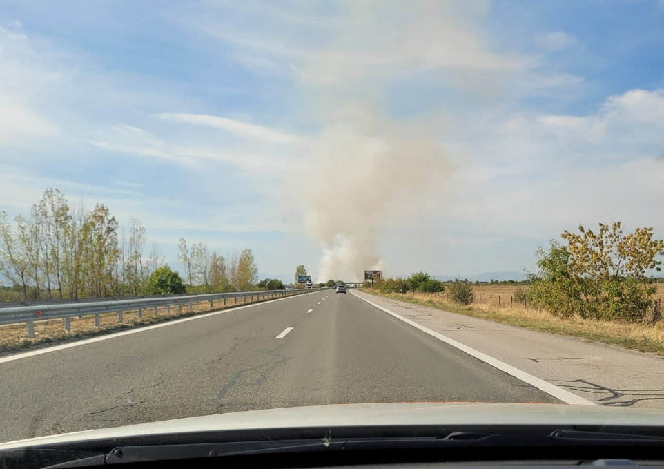 Голям пожар, който гори в тревните площи край магистрала „Тракия“ в близост до Пазарджик, е наложил движението временно да бъде спряно.