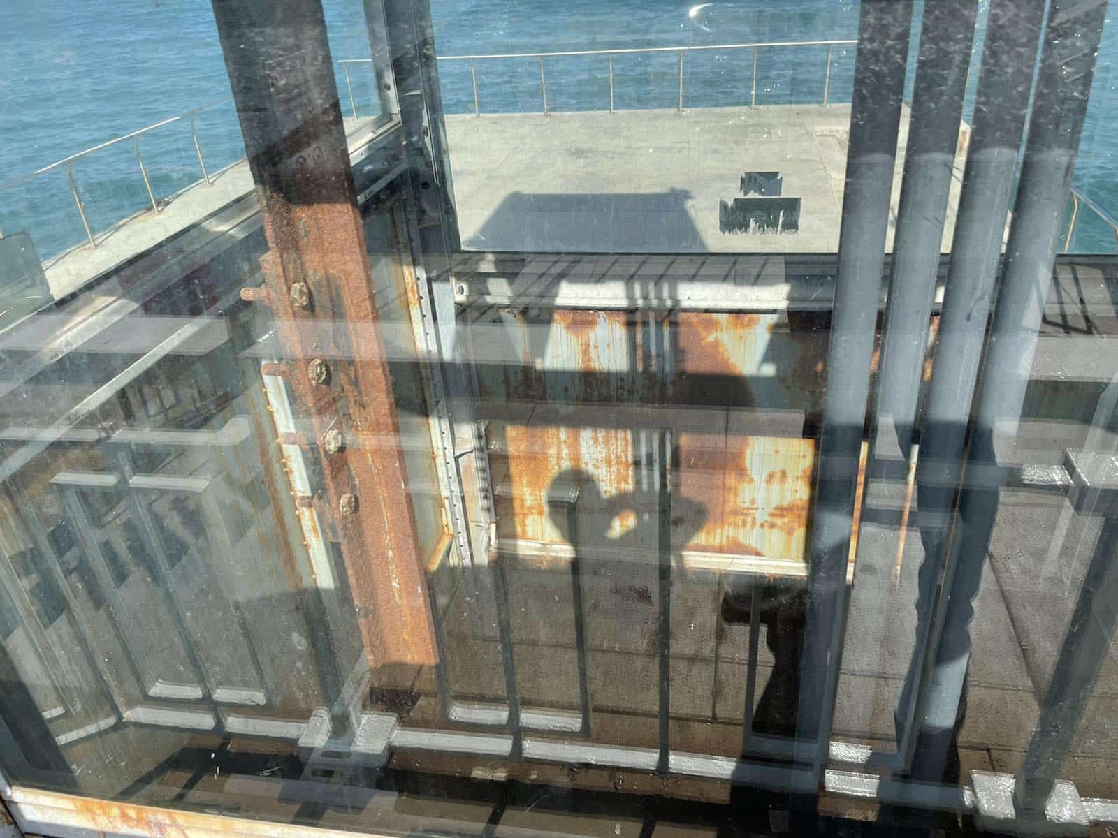 „Външната му облицовка не е достатъчно затворена, при което влизат морски изпарения и заради това всичко е ръждясало. Това съоръжения е за сухи помещения, за да се монтира точно на Моста е необходимо да е тройно по-скъпо. Причината е, че неръждаемите материали са на доста по-високи цени. Ще направим една елементарна съпоставка между асансьора и изграждането на самия Мост. За пилоните му е използвана неръждаема стомана от висок клас и през годините нито има ръжда, нито пък някакъв вид ерозия. Стоманата, обвиваща се около бетона го защитава от ерозия и Мостът изглежда непоклатим, но изработката на асансьора няма нищо общо с тези материали.“