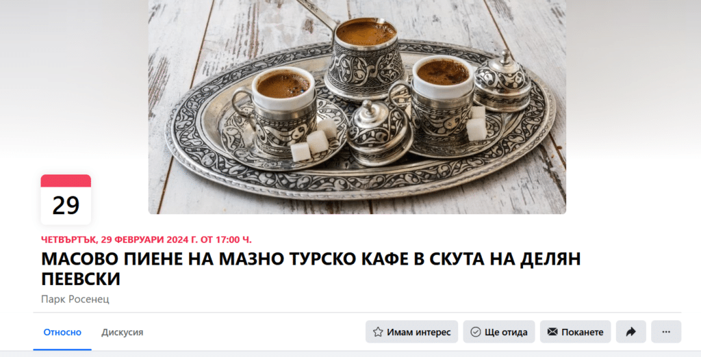 Граждани ще се съберат в парк „Росенец“ на 29 февруари, четвъртък. В 17:00 часа те ще пият мазно турско кафе в скута на Делян Пеевски.