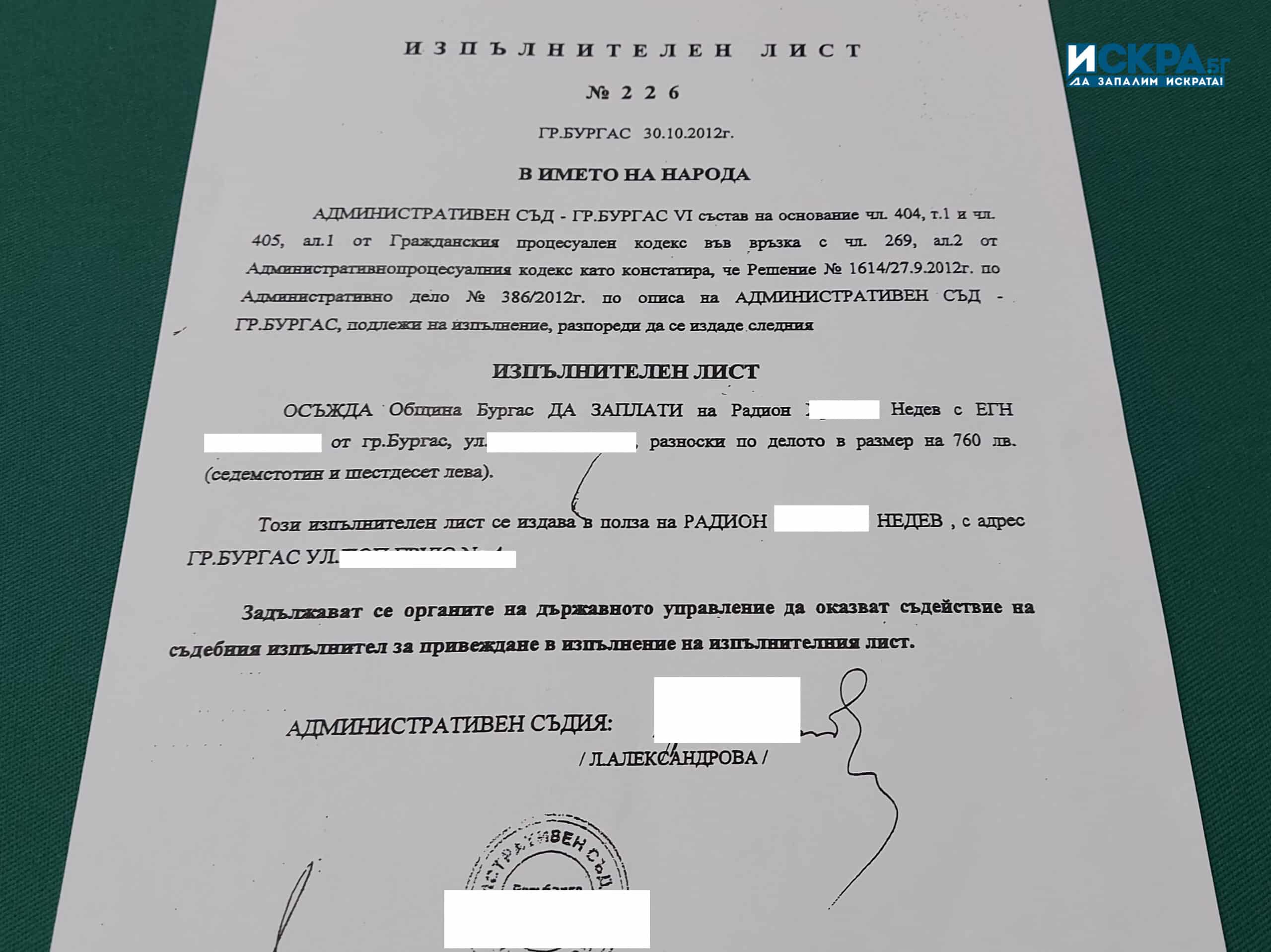 Тогава бургазлията е решил, че с търпение ще надхитри бургаската общината. Така е и станало. Той е успял да заведе дело в Административен съд-Бургас. На първото дело Община оспорва иска, но съдията назначава техническа експертиза. На второто дело съдът е решил, че осъжда Община Бургас да изплати разноските по делото и да издаде скица в едноседмичен срок.