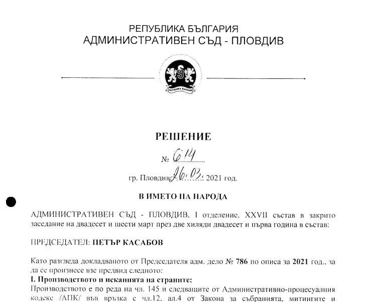 Партия „Възраждане“ оспори заповедта на Мараджиев пред съда и вчера съдът я отмени, като осъди общината да плати разноските по делото, като посочи, че заповедта е в противоречие с материално правните норми и целта на закона. Решението е окончателно. Все пак трябваше съдът да припомни на кмета какво гласят разпоредбите на закона и Конституцията на Република България, с които той вероятно не се е запознал, съдейки по работата му.