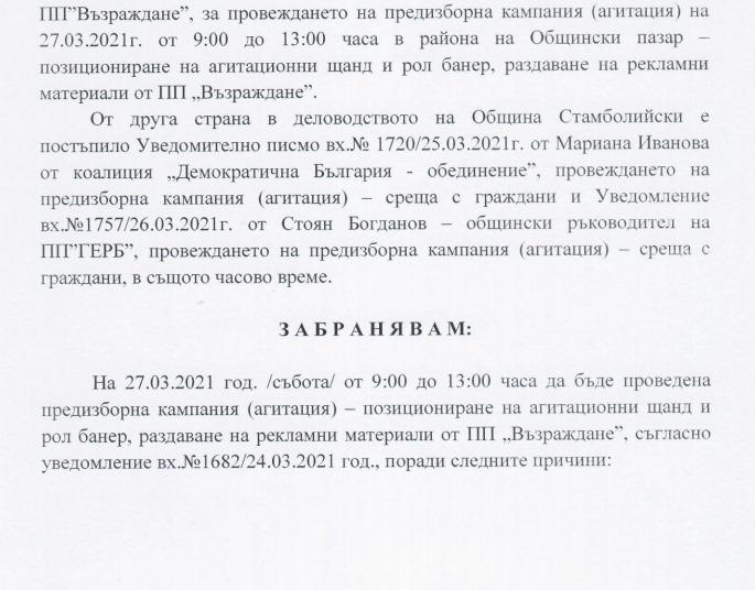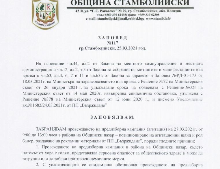 Кметът Мараджиев, в старанието си да даде предимство на своята партия, не се свени да погазва закона и конституционно гарантираните права на гражданите, както и Изборния кодекс. Все пак, човекът е на властова позиция, защо да не помогне? В четвъртък издаде заповед, с която забрани на политическа партия „Възраждане“ да проведе предизборна агитация в град Стамболийски на 27.03.2021 г., защото според него, сме представлявали сериозна опасност за общественото здраве и провеждането на предизборната кампания щяла да затрудни или забави противоепидемичните мерки.