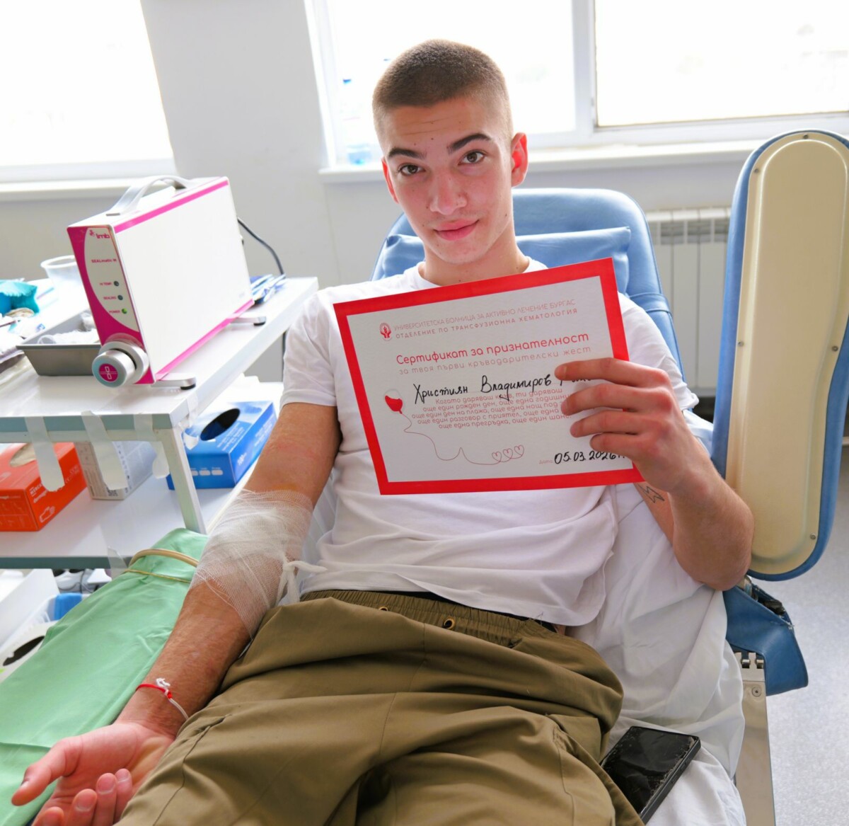 Помните ли Християн, който преди 4 години бе покосен от волтова дъга при опит за селфи върху влак на бургаската гара? Тийнейджърът, за когото стотици хора от цялата страна тогава дариха кръв, днес връща жеста. Момчето се включи в кръводарителската акция на УМБАЛ Бургас „Това не си го правил“, насочена към абитуриенти. За осма година болницата призова младите хора да започнат живота си като възрастни с добро дело – като дадат част от себе си, за да живее друг.