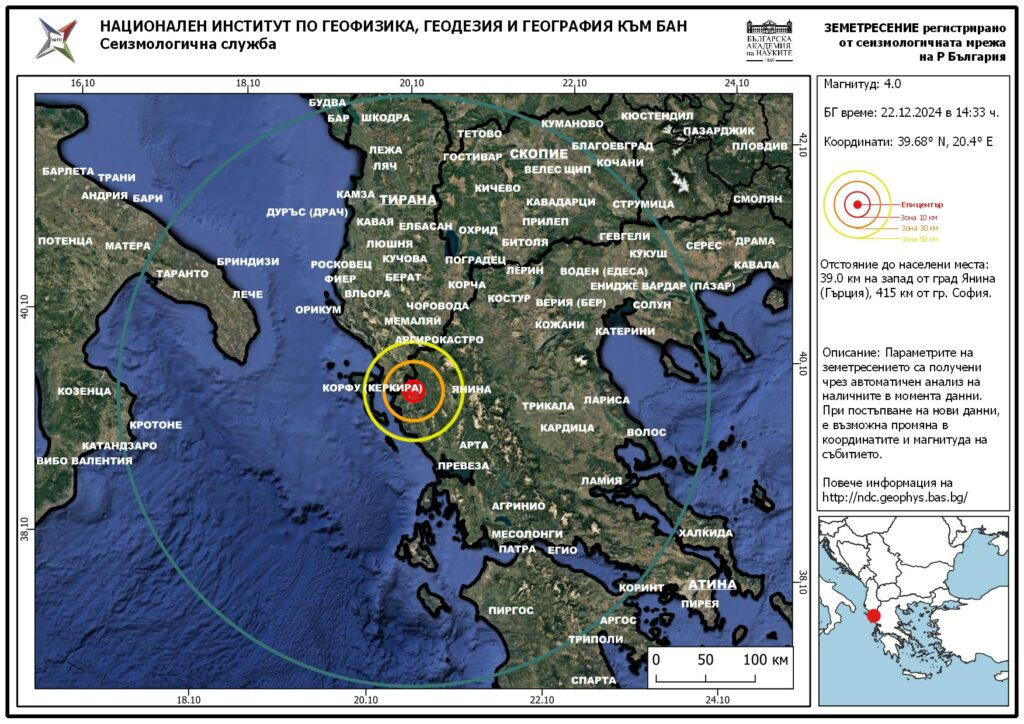 По данни на Националния сеизмологичен център към Национален институт по геофизика, геодезия и география – БАН, събитието от 22 декември 2024 г., от 14:33 часа българско време е с епицентър на 320 км от град Петрич и на 415 км от град София.
