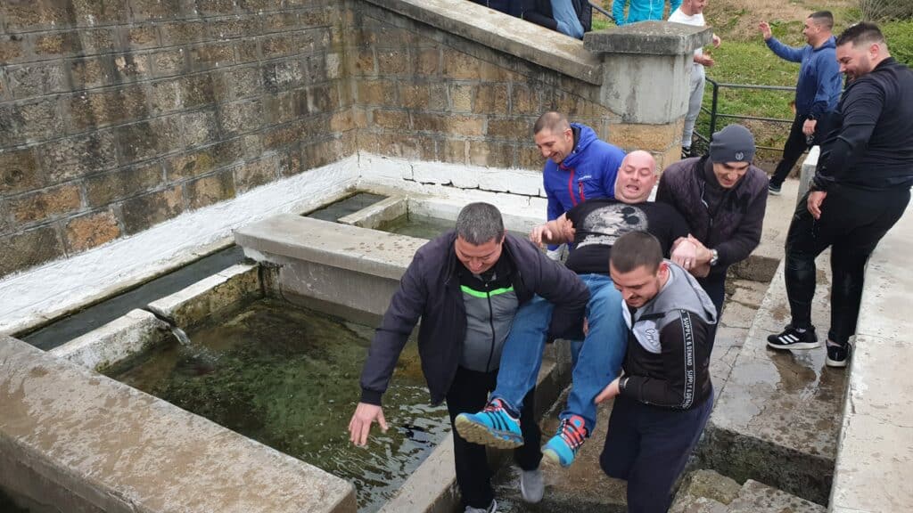 Младоженците и кумовете им бяха благословени от свещеник, а след това се потопиха в студените води на извор „Долник“ за здраве и берекет.