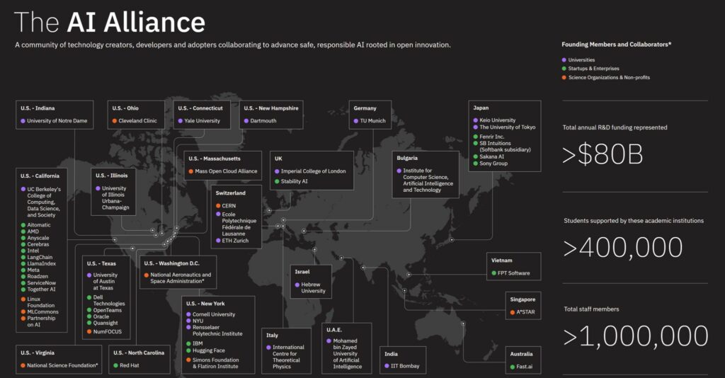 Пълен списък на членовете, които влизат в Алианса: Agency for Science, Technology and Research (A*STAR) • Aitomatic • AMD • Anyscale • Cerebras • CERN • Cleveland Clinic • Cornell University • Dartmouth College FINAL AI ALLIANCE BLOG • Dell Technologies • Ecole Polytechnique Federale de Lausanne • ETH Zurich • Fast.ai • Fenrir, Inc. • FPT Software • Hebrew University of Jerusalem • Hugging Face • IBM • Abdus Salam International Centre for Theoretical Physics (ICTP) • Imperial College London • Indian Institute of Technology Bombay • Institute for Computer Science, Artificial Intelligence • Intel • Keio University • LangChain • LlamaIndex • Linux Foundation • Mass Open Cloud Alliance, operated by Boston University and Harvard • Meta • Mohamed bin Zayed University of Artificial Intelligence • MLCommons • National Aeronautics and Space Administration • National Science Foundation • New York University • NumFOCUS • OpenTeams • Oracle • Partnership on AI • Quansight • Red Hat • Rensselaer Polytechnic Institute • Roadzen • Sakana AI • SB Intuitions • ServiceNow • Simons Foundation • Sony Group • Stability AI • Together AI • TU Munich • UC Berkeley College of Computing, Data Science, and Society • University of Illinois Urbana-Champaign • The University of Notre Dame • The University of Texas at Austin FINAL AI ALLIANCE BLOG • The University of Tokyo • Yale University.