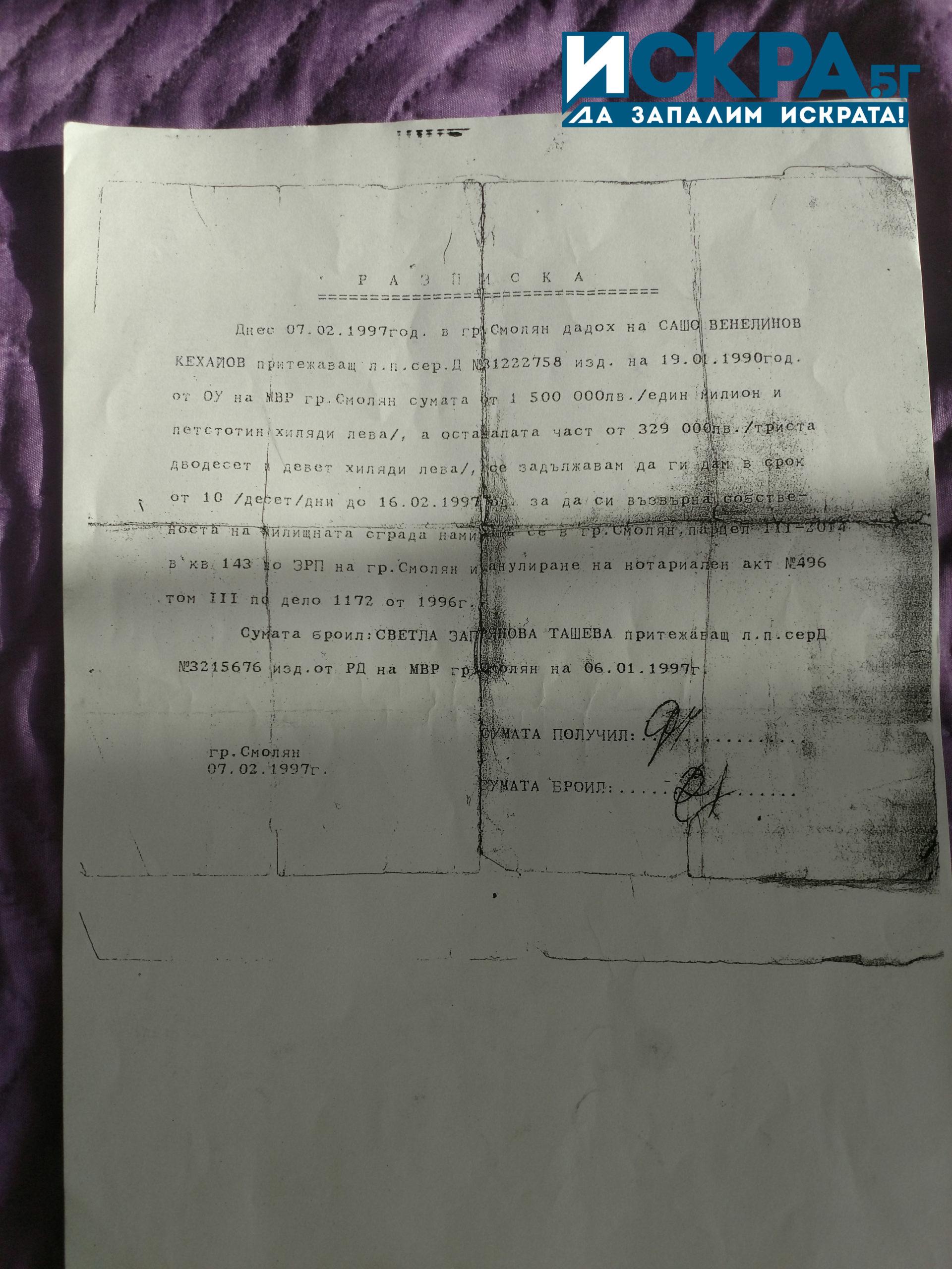 Светла разказва още, че същият този Сашо Кехайов няколко дни след това пристига в тях с нотариален акт и настоява тя да се изнесе. Двамата се договарят да анулират сделката срещу пари, като Светла Ташева е дала една част от тях, за която има разписка с неговия подпис, а другата е щяла да даде след няколко дни. Тя дала и останалите пари, но Кехайов се отметнал от договорката и изчезнал. Според нея зад всичко стои местният адвокат Станислав Ратайски и документите за къщата са при него. Кехайов му дължал пари и под натиска на Ратайски къщата била записана на негово име. Тя допълва, че брат ѝ Минчо е бил убит преди 19 години.