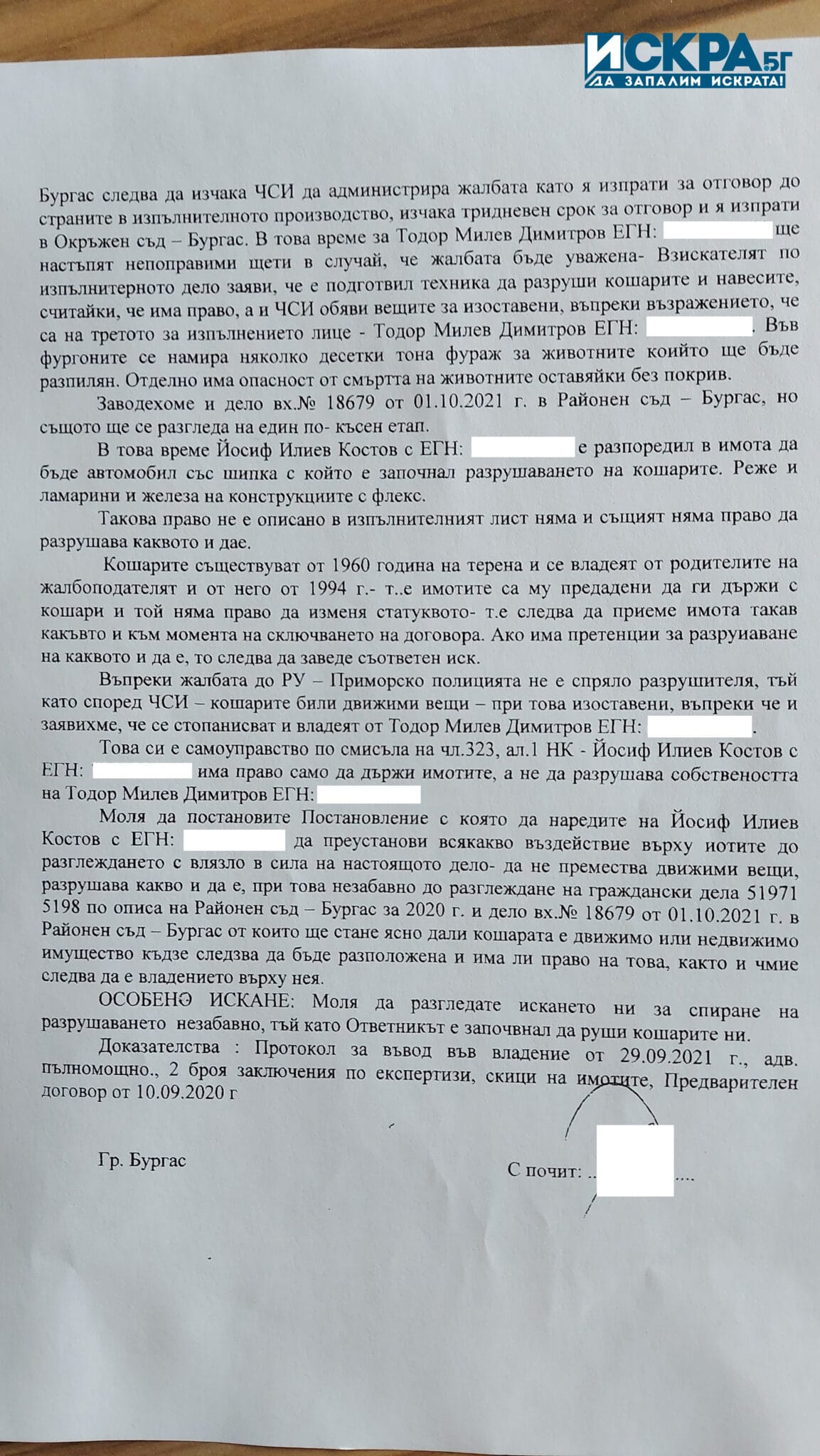 „Йосиф дойде миналата година с някакви документи от община Приморско и ни каза: „Тази кашла е моя“. Той поиска 10 000 лева, за да може да ползваме имота до април 2020 година, но ние си наехме адвокат, защото не искахме да му дадем парите. След като не се махнахме от имота, той започна да събаря кошарите и да ни реже цистерните. Йосиф ни каза, че частен съдебен изпълнител му е дал правото да го направи, без да са прекратени делата.„